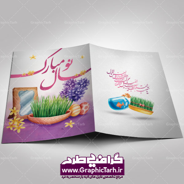 - کارت تبریک نوروز بصورت دو لت با تایپوگرافی سال نو مبارک ، هفت سین ، سبزه ، تنگ ماهی قرمز و …