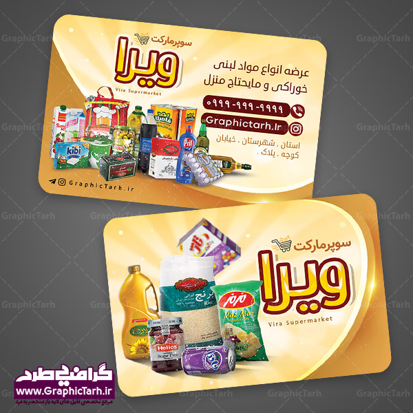- طرح کارت ویزیت مغازه سوپری مناسب تبلیغات سوپر مارکت ، هایپرمارکت و فروشگاه های عرضه مواد غذایی و لبنی